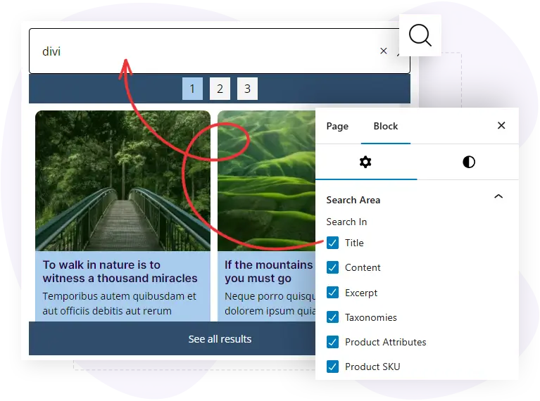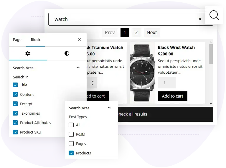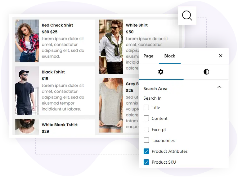Easily control the search area by choosing to search within titles, excerpts, content, taxonomies, product attributes, or product SKUs—right from the block settings.